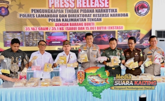 PALANGKA RAYA, MEDIASUARAKALTENG.ID – Petugas Kepolisian dari Polres Lamandau bersama Direktorat Reserse Narkoba Polda Kalimantan Tengah berhasil mengungkap kasus peredaran narkotika dalam jumlah besar dengan barang bukti 35,1 kilogram sabu dan 15.061 butir ekstasi.