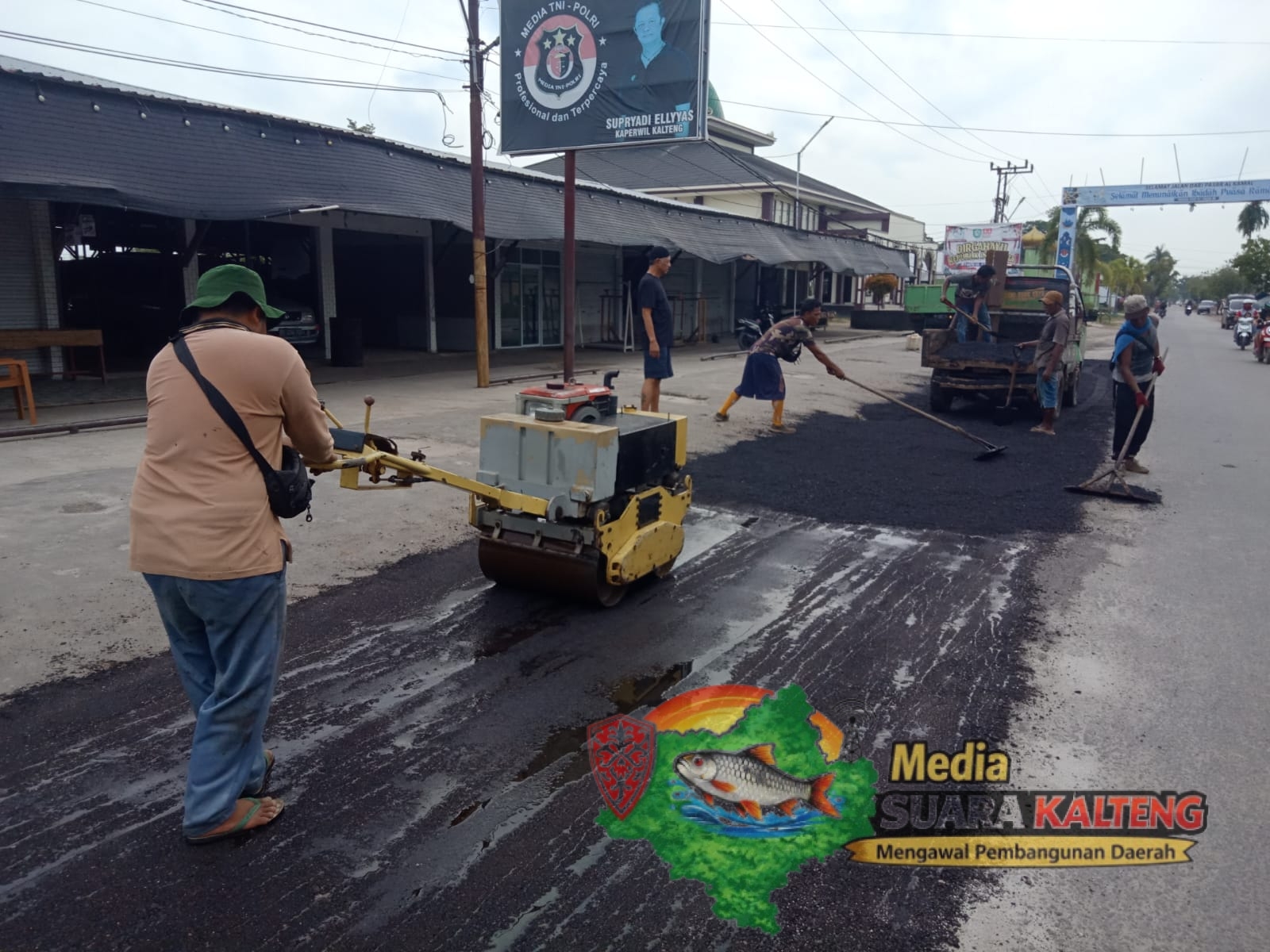 KOTIM, MEDIASUARAKALTENG.ID – Demi menjaga kenyamanan dan keamanan pengunjung, pihak pengelola Pasar Tradisional Al Kamal Sampit, Kabupaten Kotawaringin Timur (Kotim) melakukan pengaspalan jalan di depan area pasar secara mandiri dan swadaya.