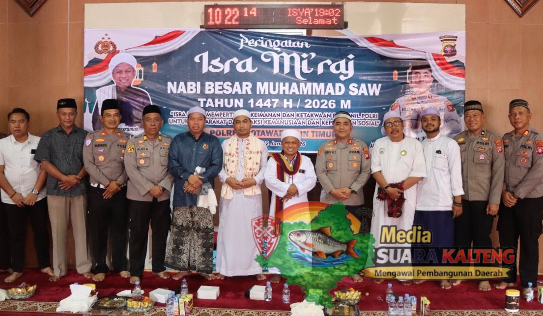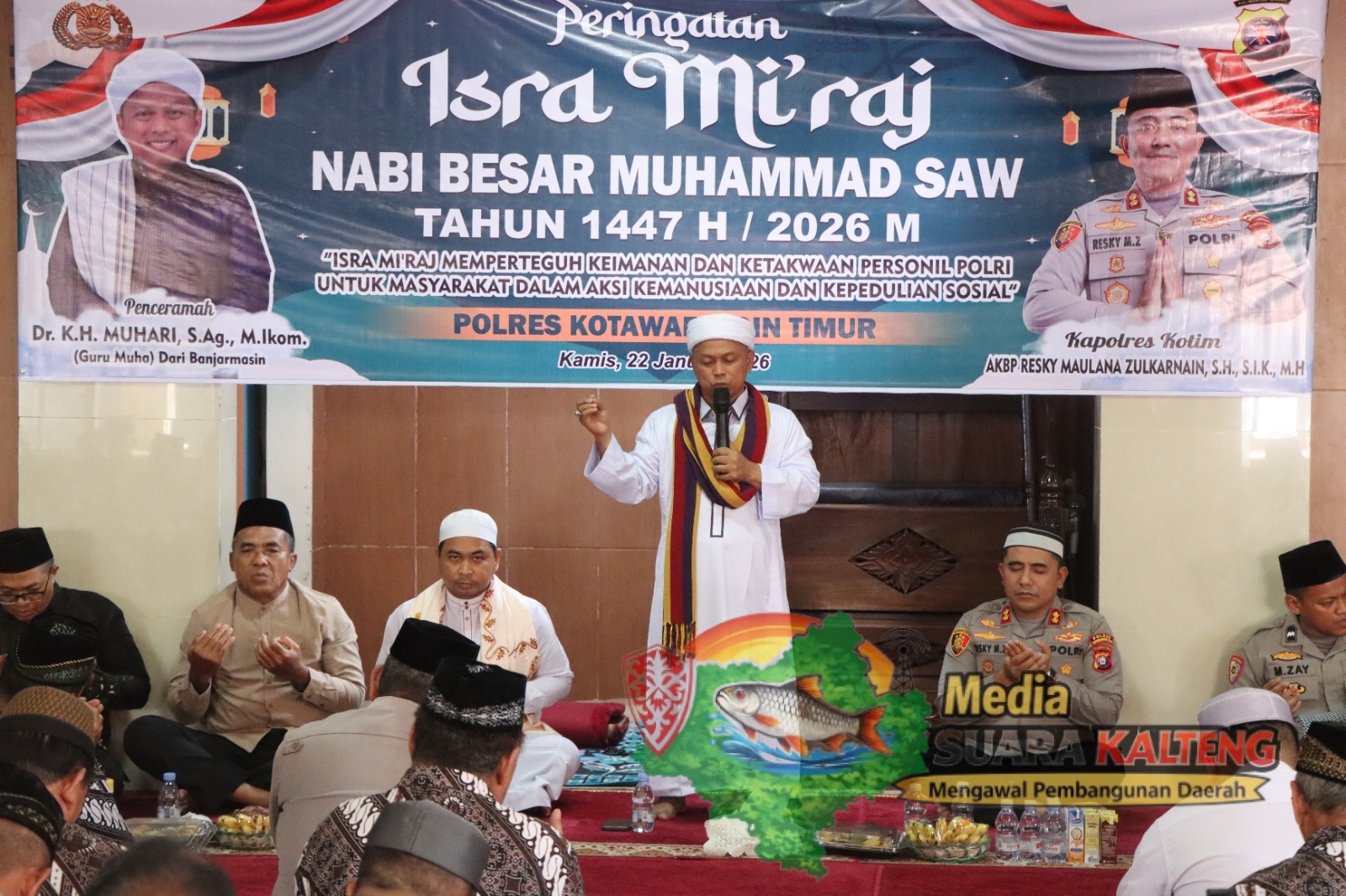 KOTIM, MEDIASUARAKALTENG.ID – Polres Kotawaringin Timur (Kotim), Polda Kalimantan Tengah, menggelar peringatan Isra Mi’raj Nabi Besar Muhammad SAW 1447 Hijriah/2026 M yang dilaksanakan di Masjid Al Muslih, Komplek Asrama Polri Polres Kotim, Jalan MT Haryono, Sampit, Kamis pagi (22/1/2026).